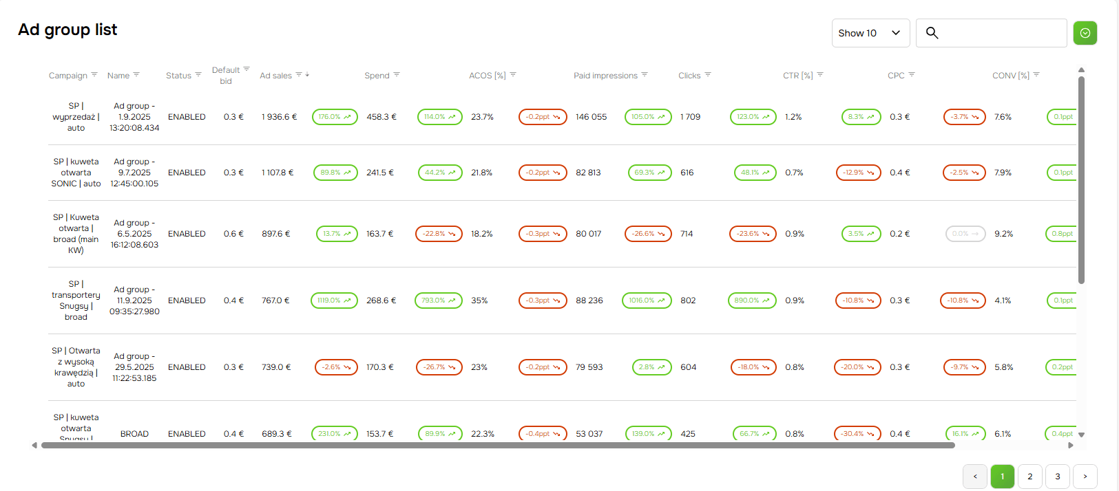 Provides a detailed list of your ad groups, displaying critical performance metrics such as ad sales, spend, and acos (advertising cost of sale). It also includes engagement metrics like impressions, clicks, ctr (click-through rate), and cpc (cost per click), allowing you to assess the effectiveness of each ad group. The data can be used to monitor ongoing campaigns, analyze bid strategies, and make informed adjustments to optimize campaign performance. This tool is essential for tracking the health of your ad groups and improving your advertising ROI.