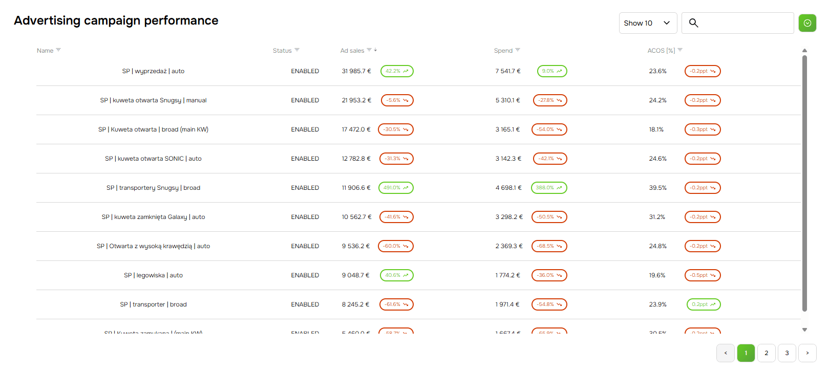 Provides an at-a-glance summary of your advertising campaigns, showcasing critical metrics such as ad sales, total spend, and acos. It enables you to quickly evaluate how well each campaign is performing, identifying which are driving the most sales and where you might be overspending. by monitoring acos, you can assess the efficiency of your campaigns, adjusting bids or strategies for better results. campaigns with lower acos indicate better cost efficiency, while higher acos may signal a need for optimization. Overall, this tool is essential for keeping your ad strategy on track and improving your return on investment.