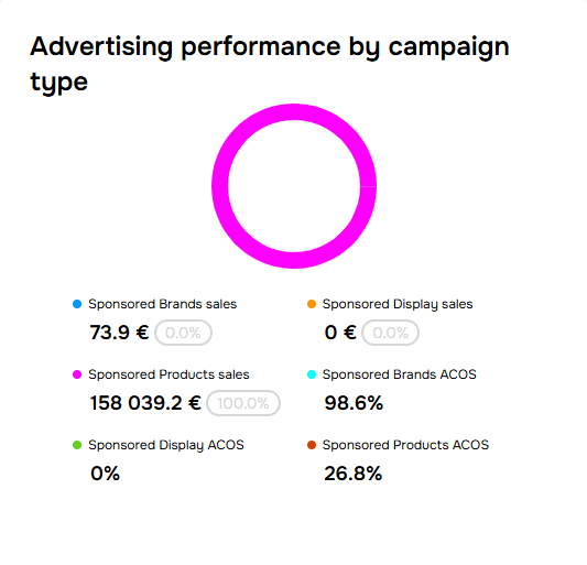 Offers a clear breakdown of advertising performance based on campaign types, giving you a snapshot of how each type contributes to overall sales and advertising costs. it displays the percentage of sales generated by sponsored products, sponsored brands, and sponsored display, alongside their respective acos (advertising cost of sales). By reviewing these metrics, you can identify which campaign types are driving the most sales and how efficiently they are using your advertising budget. This tool is essential for optimizing your advertising mix to ensure the best return on investment across different campaign formats.