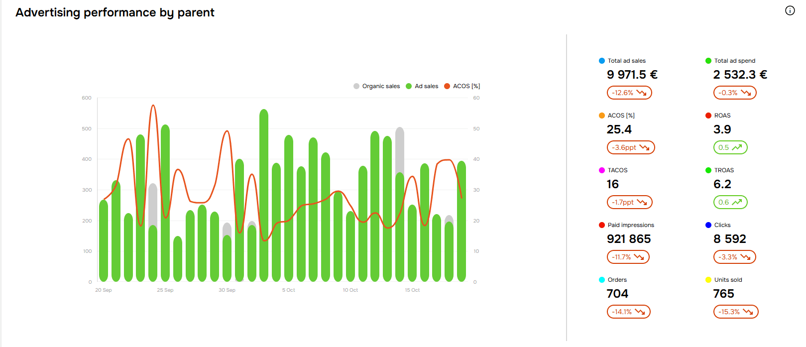 Allows you to track the historical performance of your advertising campaigns by illustrating trends in both ad and organic sales, alongside acos. by showing key metrics such as impressions, clicks, and orders, it helps you assess the effectiveness of your campaigns over time. The graphical representation of ad and organic sales allows for an easy comparison, helping you identify peaks and dips in performance. monitoring the acos trend ensures you are keeping your advertising costs under control, while the summary provides a clear breakdown of ad sales and spend, allowing for data-driven adjustments to your ad strategies. This tool is essential for optimizing your campaigns to improve overall sales and profitability.