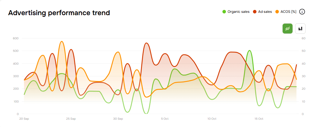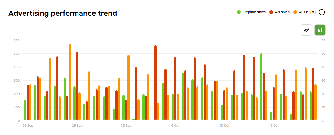 Provides a visual representation of the relationship between ad sales and organic sales, with ACOS plotted as a line graph. The bars in the chart represent the daily amount of ad sales (blue) and organic sales (gray). ACOS (orange line) shows how efficiently ad spend translates into sales, with fluctuations indicating changes in advertising efficiency or campaign optimization efforts. This allows advertisers to track the impact of their advertising investments and adjust strategies to balance ad-driven and organic sales growth.