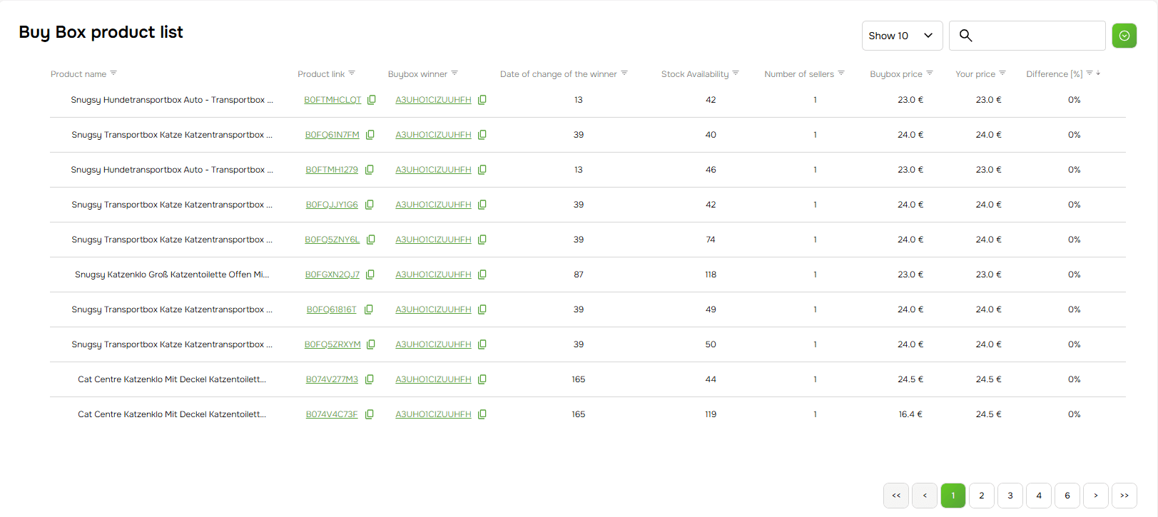 Provides a comprehensive list of your products, displaying whether you are winning or losing the buy box, along with key details like availability, the buy box price, and your current price. By comparing your price to competitors, you can adjust your pricing strategy to improve your chances of winning the buy box. This insight allows you to make real-time decisions to increase product visibility and sales.