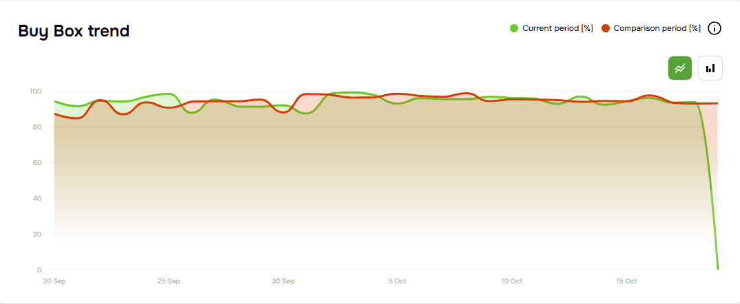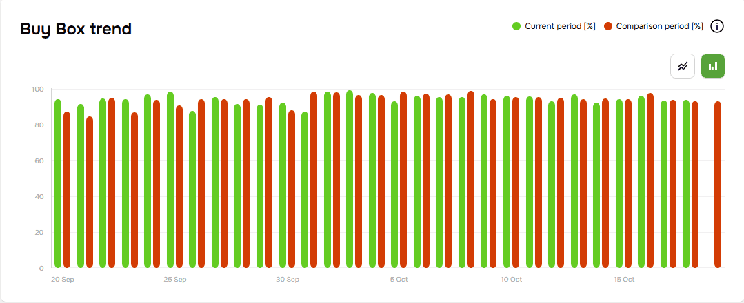 Provides a historical view of your buy box win rate, showing how frequently your products secure the buy box over a given period. By monitoring these trends, you can better understand the factors affecting your buy box performance, such as pricing, fulfillment method, and competition. This insight enables you to make strategic adjustments to increase your chances of winning the buy box, ultimately improving visibility and sales.