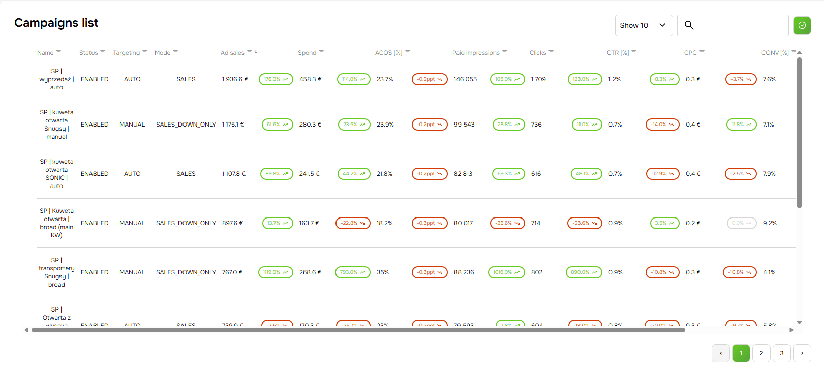 Offers a comprehensive view of your active campaigns, breaking down essential performance indicators such as ad sales, advertising spend, and acos (advertising cost of sale). Additionally, it highlights key engagement metrics, including impressions, clicks, ctr (click-through rate), and cpc (cost per click), allowing you to evaluate the effectiveness of your ads. This data helps identify top-performing campaigns, assess bidding strategies, and optimize overall advertising efforts for maximum ROI. It's a powerful tool for continuously monitoring and adjusting campaign tactics.
