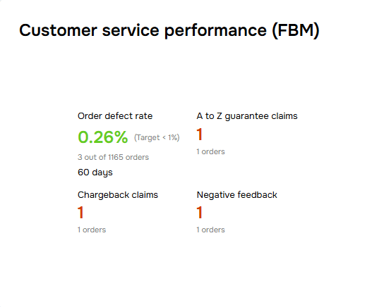 Tracks essential customer service metrics like your order defect rate, a-to-z guarantee claims, chargeback claims, and negative feedback. it ensures you meet the performance targets for providing exceptional service to your customers. With real-time monitoring of these metrics, you can take proactive actions to resolve potential issues, minimize defects, and handle claims quickly. Maintaining a low defect rate and zero claims positively impacts your store's reputation and can boost customer loyalty, leading to better long-term performance.
