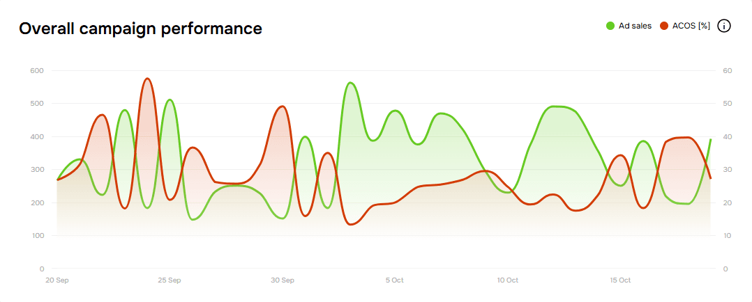 Provides an overview of the overall performance of your advertising campaigns, visualizing key metrics such as ad sales and acos over time. The bar chart displays the fluctuations in ad sales, while the line graph tracks changes in the advertising cost of sales (acos). together, these insights help you analyze the effectiveness of your campaigns, allowing you to optimize ad spend and maximize returns. By understanding these trends, you can identify high-performing periods and areas where adjustments may be needed to improve campaign efficiency.