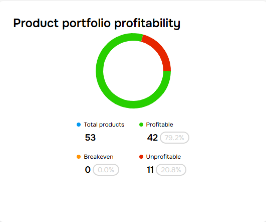 Provides a visual overview of your product portfolio's profitability, showing how many of your products are profitable, breakeven, or unprofitable. with a clear pie chart, you can quickly assess which products are driving profits and which may require adjustments. This insight helps you refine your product strategy, focusing on the items that contribute to your bottom line and addressing those that are underperforming.