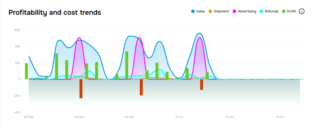 Provides a visual representation of your profitability, displaying key metrics such as sales, shipping, advertising costs, and refunds. By tracking these elements over time, you can monitor how they impact your overall profit. The widget helps you understand cost trends and make data-driven decisions to improve profitability by optimizing expenses and increasing sales efficiency.