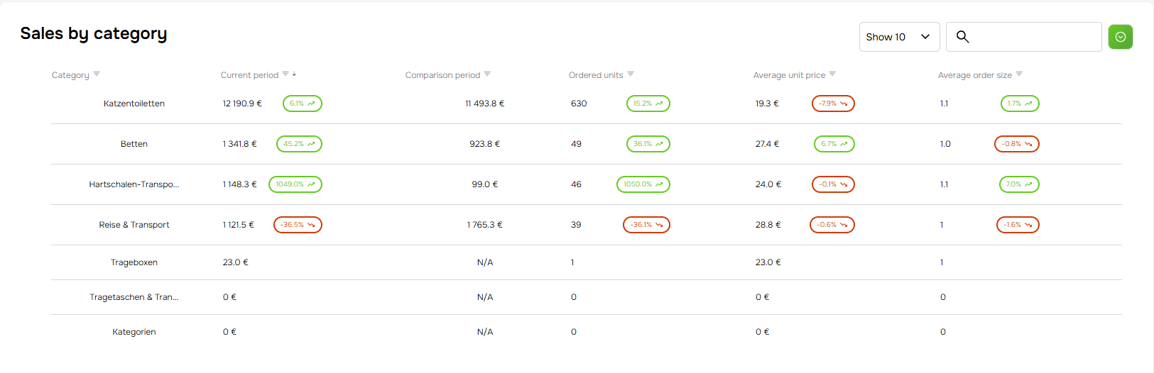 Provides a detailed view of your sales across different product categories, comparing the current period's performance to the previous one. by tracking key metrics such as units sold, average unit price, and total sales, you can easily identify which categories are driving growth and which may require additional focus. This data helps you optimize inventory and marketing strategies to improve overall business performance.