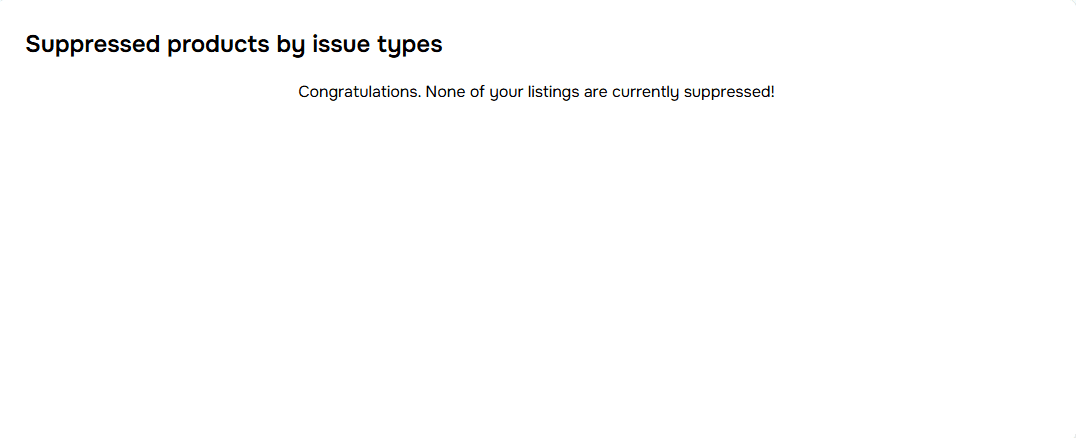 Provides a breakdown of your suppressed products based on specific issue types, such as missing product titles, images, attributes, or incomplete descriptions. By categorizing the problems, you can quickly identify the most common issues affecting your listings and prioritize corrective actions. This helps you resolve the problems efficiently, ensuring your products are listed correctly and available for sale.