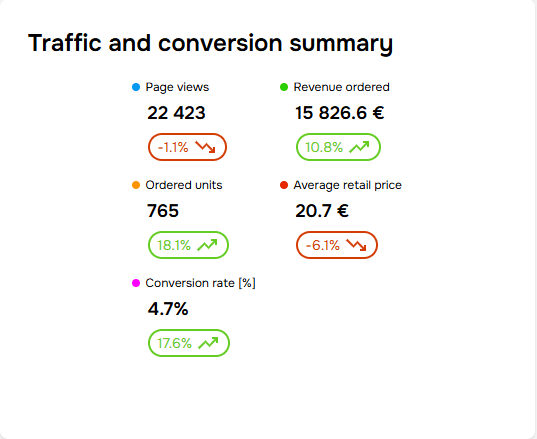 Provides an at-a-glance summary of your store's key metrics, including page views, total revenue, ordered units, and conversion rate, along with their percentage changes from the previous period. By tracking these core performance indicators, you can better understand your sales dynamics and identify areas that need improvement or optimization. This data empowers you to make informed decisions to drive growth and improve your conversion rates.