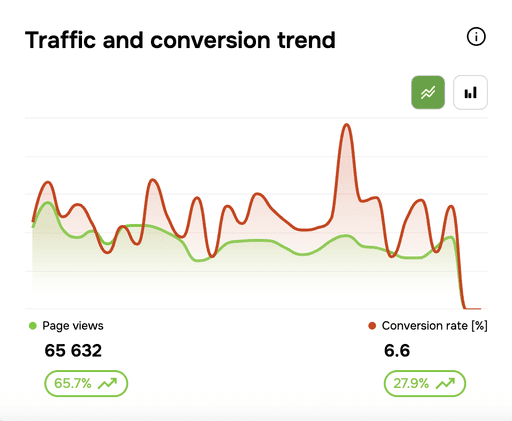 Widgets showing website traffic, conversion rates, and device mix (browser/mobile). Used to monitor marketing campaigns and product page quality.